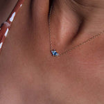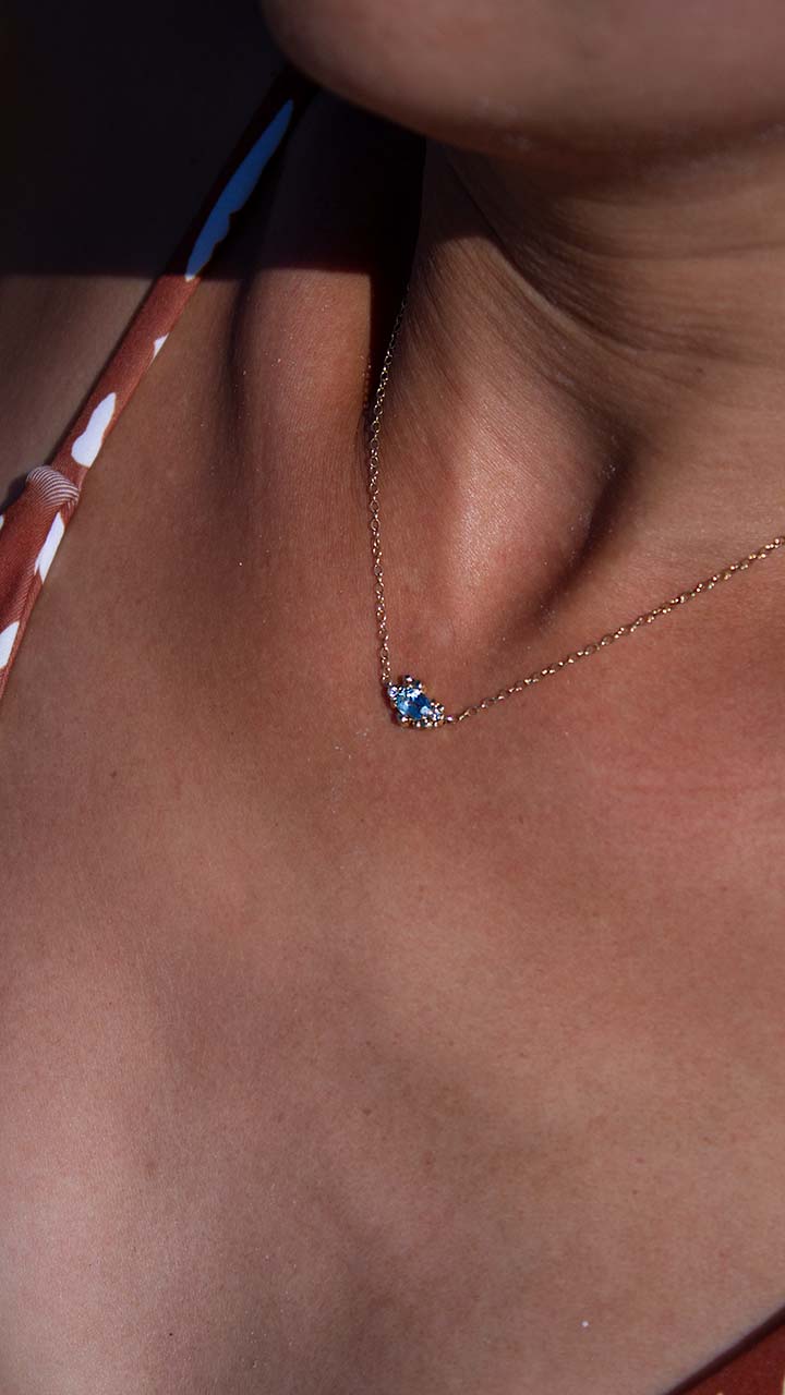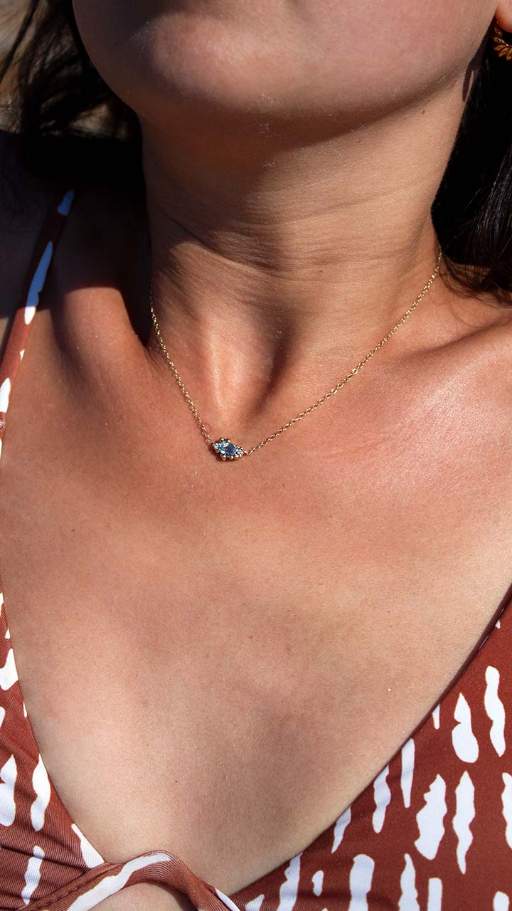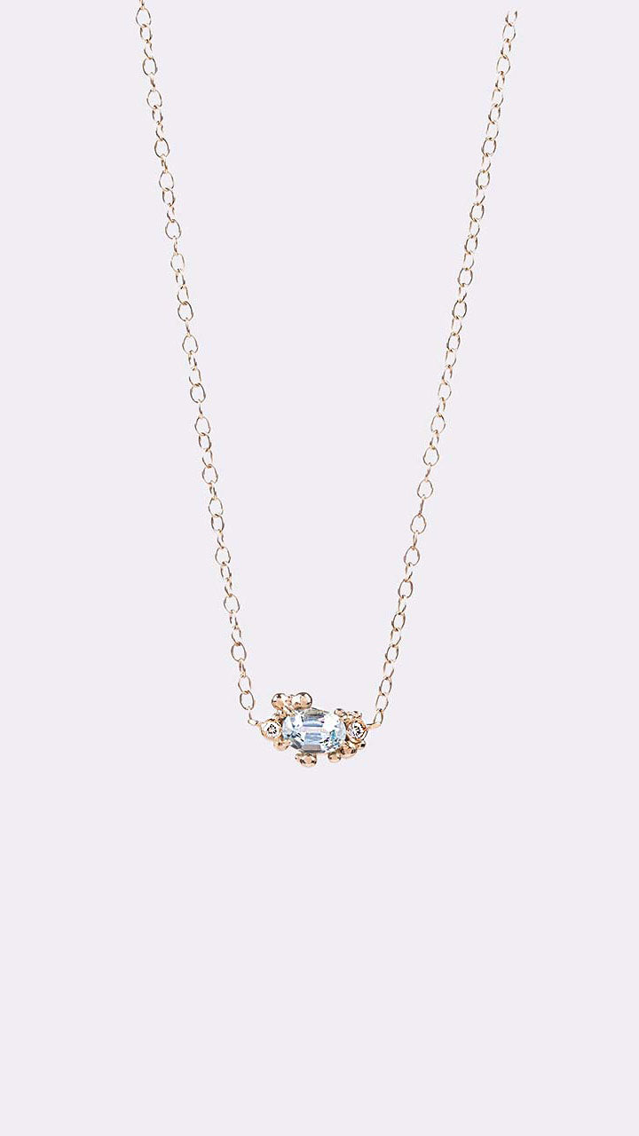 The Aquamarine & Diamond Divinus Pendant - a stunning piece of jewellery that embodies inspiration and empowerment. This pendant is handcrafted in 9ct yellow gold with intricate granulation detail and features an oval centrepiece and diamond accents. The piece has been divinely inspired by our recent rebirth and features natural gemstones that promote happiness, love, abundance, and tranquillity. Each pendant is made to order, specifically for you, and may take 3-6 weeks for delivery. The pendant is set with two round diamonds and a central oval peach tourmaline stone and measures 12.90mm in width, suspended from a 16" chain. Experience the magic of Divinus and wear it with pride.