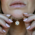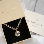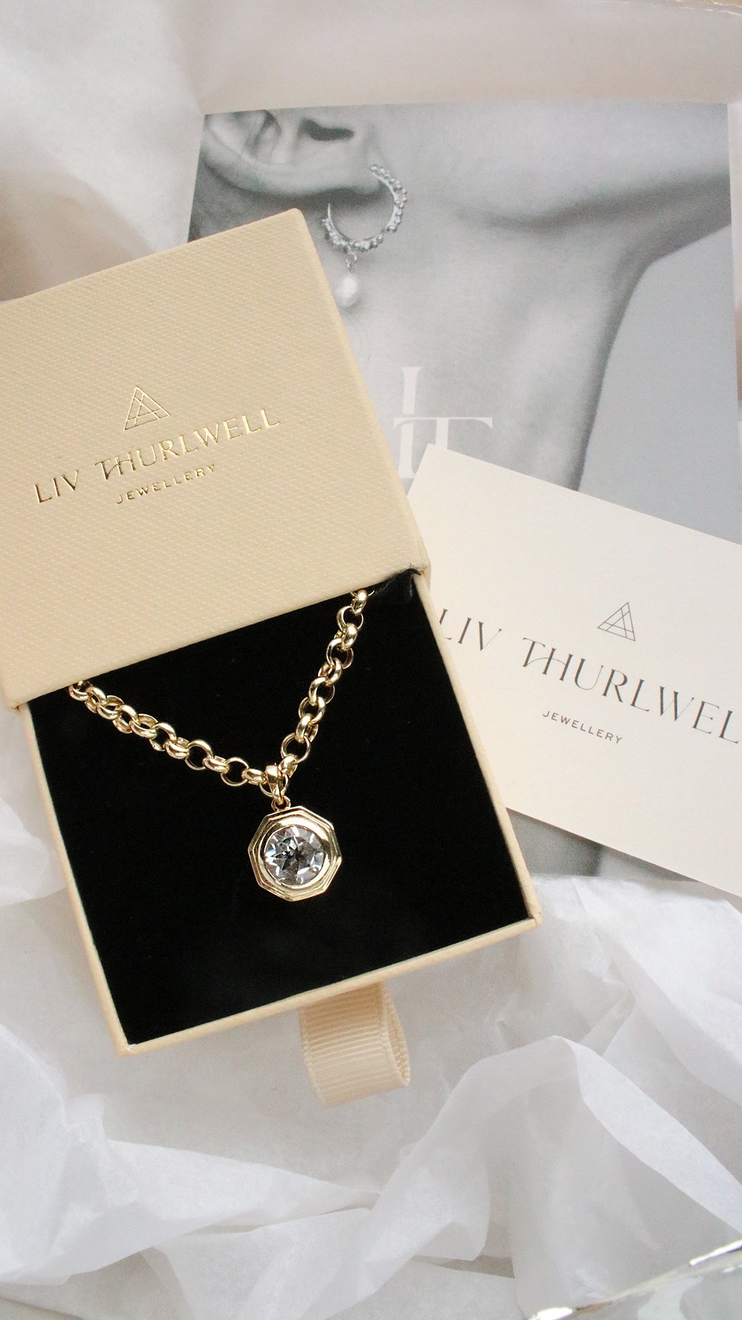 Elevate your Jewellery collection with this exquisite Art Deco-inspired pendant, crafted in solid gold. The hexagonal design features a captivating 7mm round white topaz at the center, with the option to upgrade to a brilliant diamond for added luxury. Paired with a chunky belcher chain (18"), this pendant makes a bold statement with maximum effect.