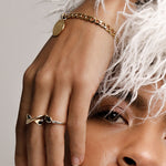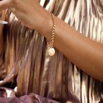 The Callista Hammered Disc Chain Bracelet blends tradition with a modern flair. Its design is a nod to the timeless allure of celestial patterns. The flat Cuban link chain introduces a contemporary twist, symbolizing the unbroken thread that connects the past and the present. With delicate oval links, this bracelet invites you to elevate your style with its refined aesthetic.