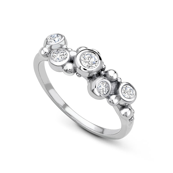 This design features five stunning round brilliant-cut white Diamonds in their own granulated rub-over settings. Available in solid 9ct,18ct gold or platinum. The band flows delicately round to really accentuate the central stone display. All diamonds are VSI clarity and G-H colour.