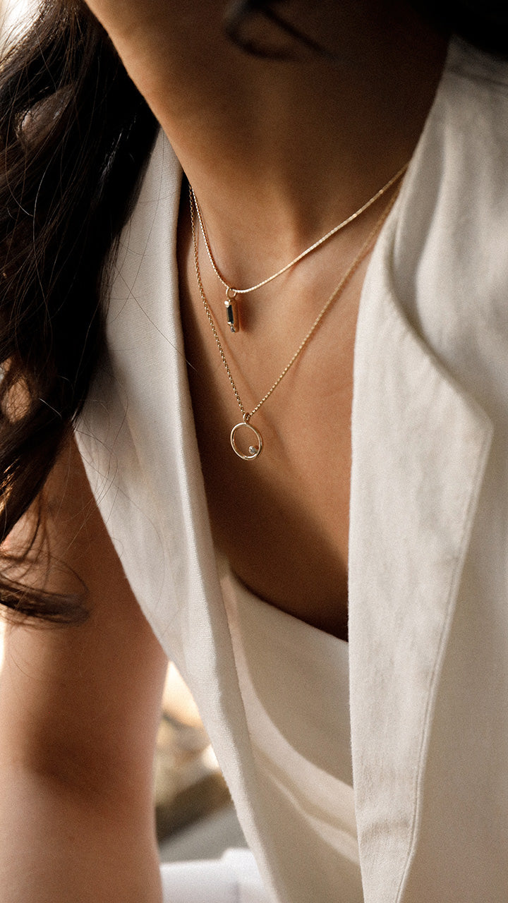 Expertly handcrafted in our southeast studio, this elegant necklace features a delicate 18" gold chain and a stunning gold circle pendant with a single-set diamond. The simplicity of the design makes it versatile enough to be worn on special occasions or as an everyday accessory.