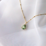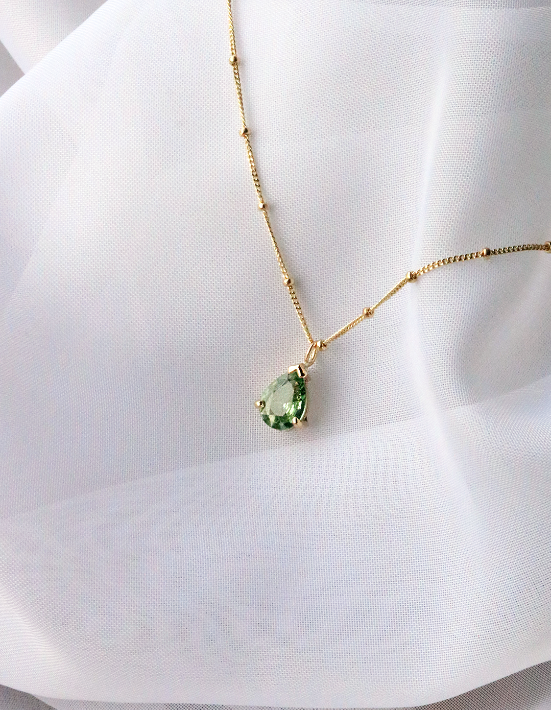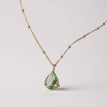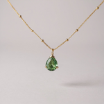 An elegant 18-inch 9ct gold ball chain featuring a stunning pear-cut green sapphire, securely claw-set to showcase its natural brilliance. The vibrant green hue of the sapphire brings a fresh, captivating energy, perfectly contrasted against the warm glow of gold. Designed to be timeless yet striking, this piece is ideal worn alone as a statement or layered for a modern, refined look.