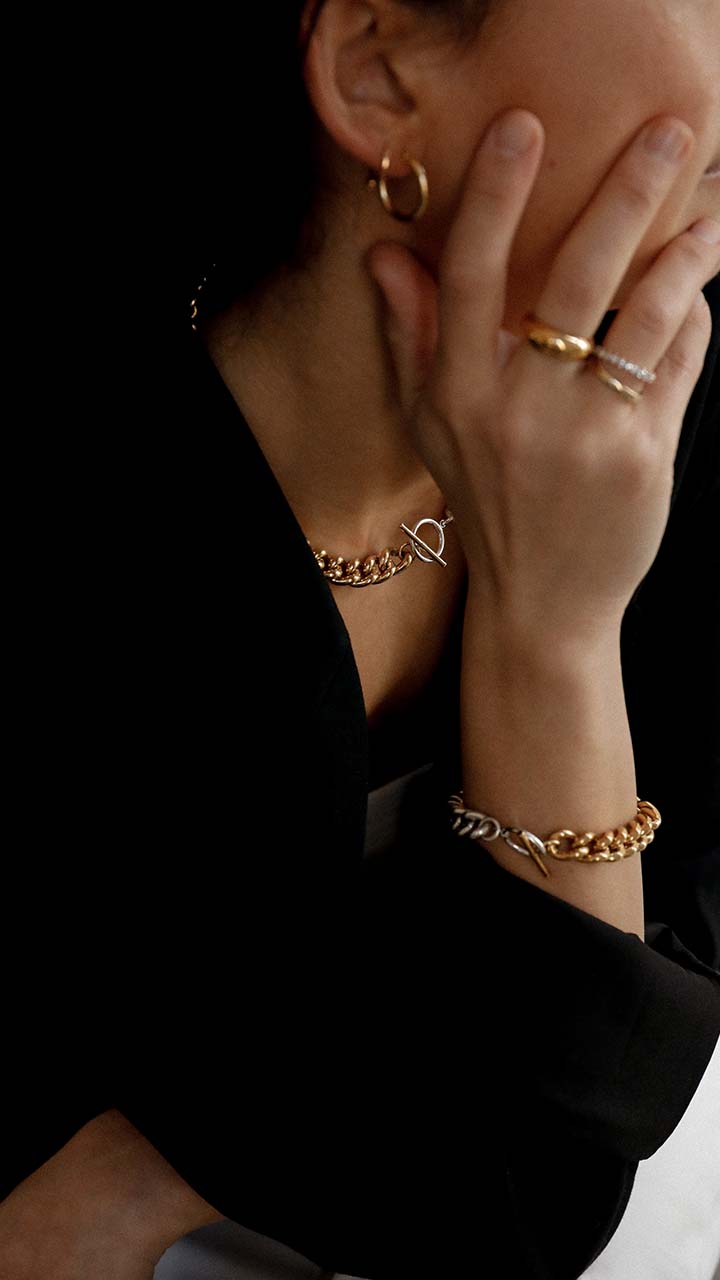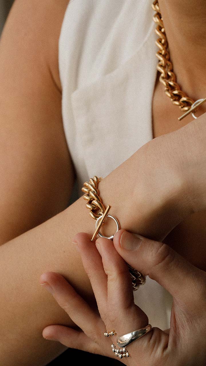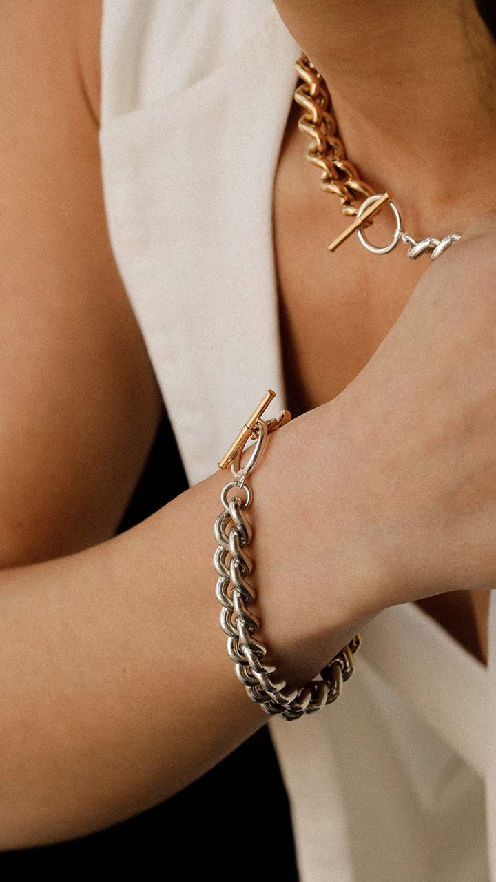 Introducing our latest collection, the Chunky Two-Tone Chain necklace and bracelet - a bold and unique addition to your jewellery collection. Each piece has been expertly handcrafted to make a statement, whether worn alone or as a set. The necklace and bracelet both feature links made from Sterling Eco Silver, with 18ct gold vermeil detailing halfway around the links for a touch of luxurious sophistication. The combination of silver and gold creates a stunning two-tone effect that will enhance any outfit. The T-bar fastening ensures a secure fit while adding an additional touch of style to this already eye-catching piece. With a polished finish, this necklace and bracelet duo is sure to turn heads and make you feel confident and stylish every day. Don't miss out on the chance to elevate your look with our Chunky Two-Tone Chain collection.