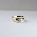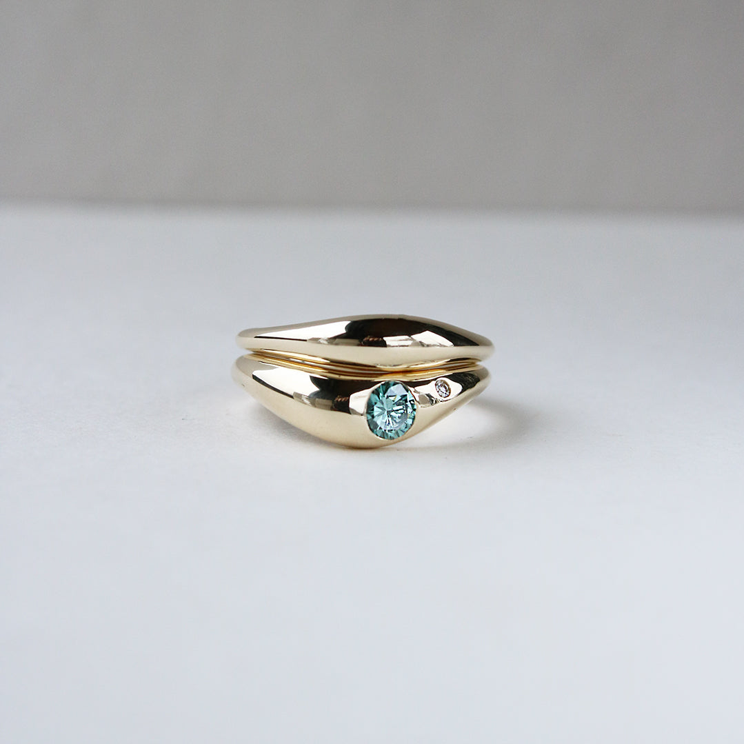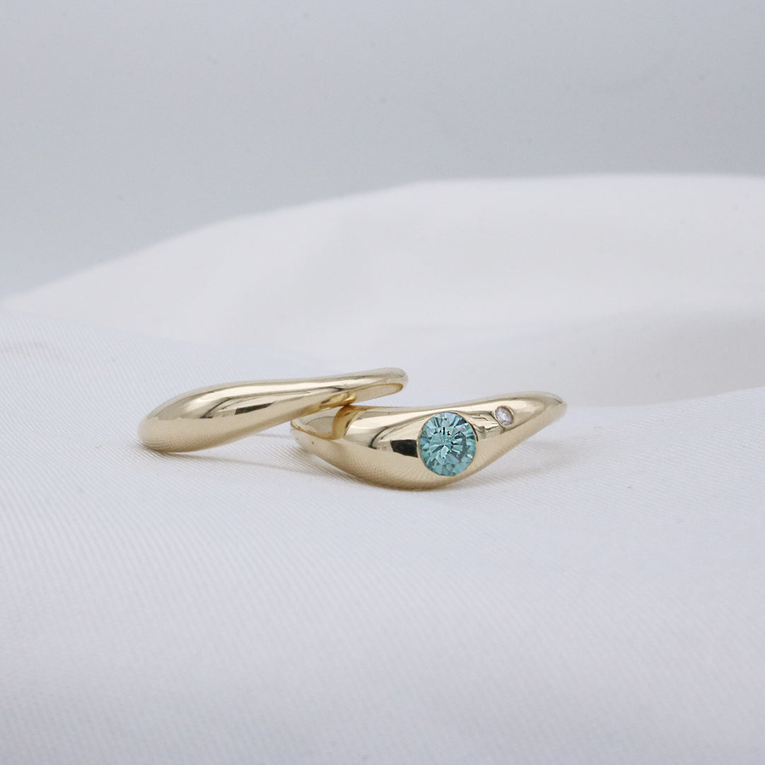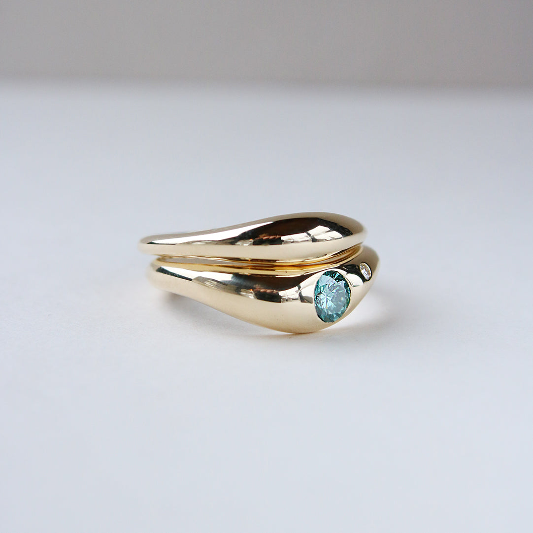 This handcrafted organic wave ring stack exudes timeless elegance and modern artistry. Its flowing, sculptural design cradles a stunning 3mm round blue diamond, accented with a delicate 1.5mm brilliant-cut diamond for added sparkle. Perfectly balancing bold beauty and subtle sophistication, this ring makes a statement of individuality and grace.